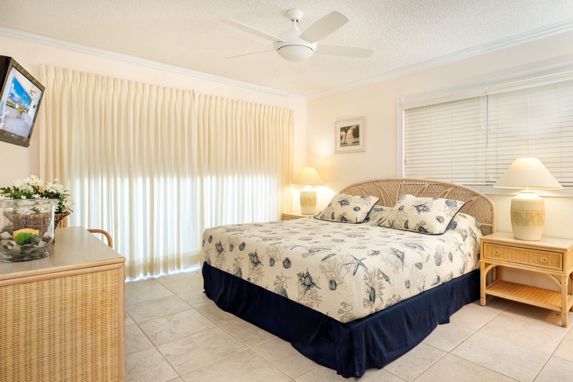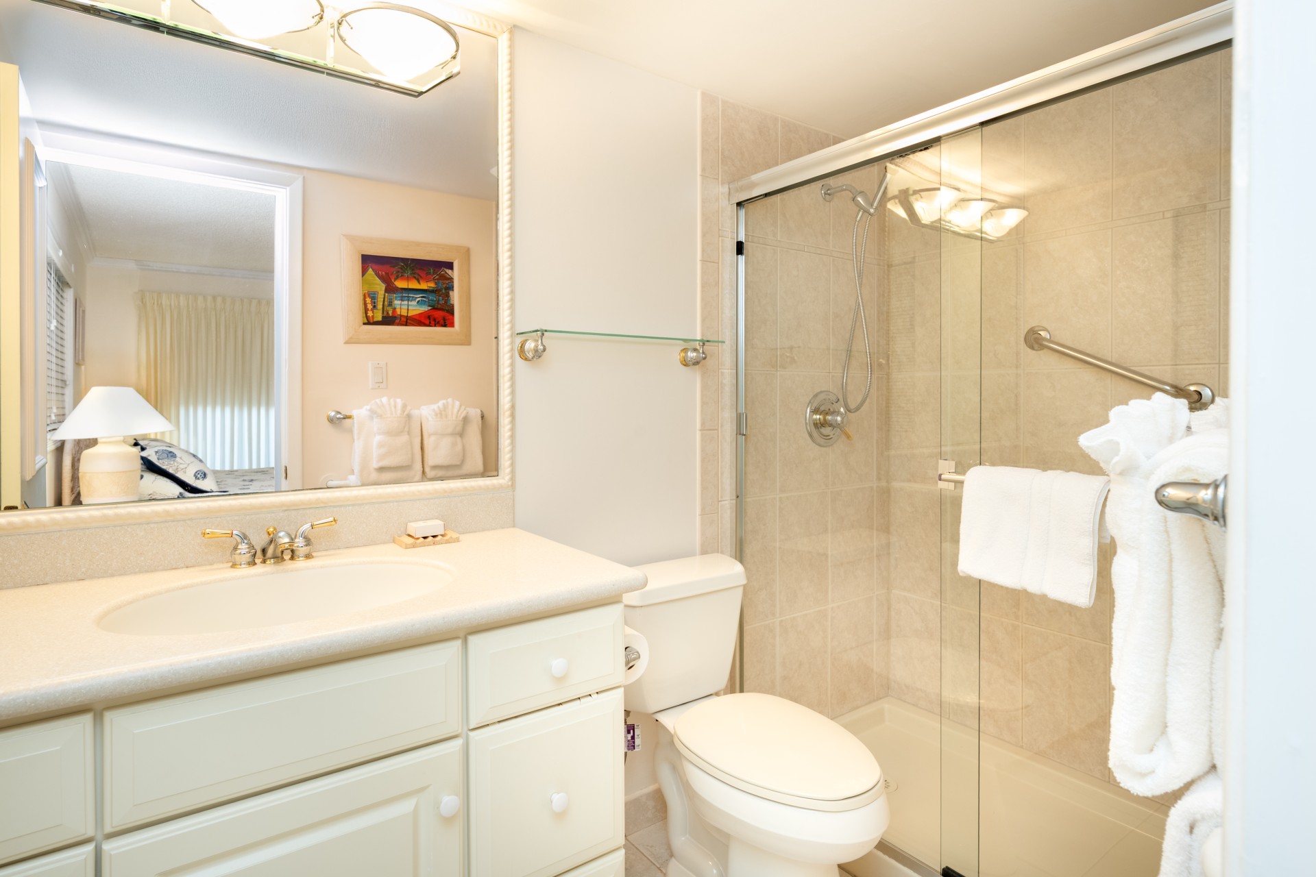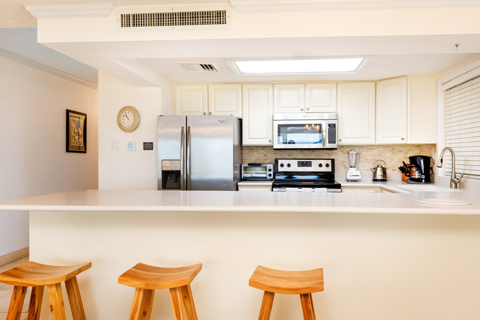 Fully equipped kitchen with stainless steel appliances. The living/dining area is bright with beautiful furniture, queen sleeper sofa. King size bed in master brm. Two twins in 2nd brm which can be converted to king bed. Bathrooms off each bedroom. Living rm flat screen TV, DVR, DVD & both bedrooms have flat screen TV’s. Free calls to US & Canada included. Full size washer/dryer in condo. Screened In patio.